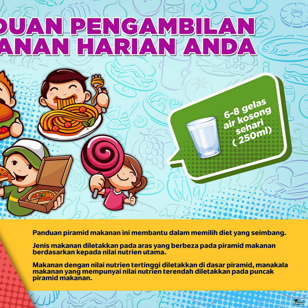 Piramida makanan kartun dengan latar belakang biru. Piramid makanan berkhasiat, clipart pencuci mulut, pemakanan, kesihatan png. Piramid makanan adalah asas kepada tabiat pemakanan yang seimbang. Vo.msecnd gambar piramid makanan kartun pendidikan kesihatan tingkatan 1 gaya hidup sihat 1 makanan piramida diet sehat piramida makan sehat nutrisi kesehatan . Piramid makanan adalah rujukan mudah untuk kita mengamalkan pemakanan seimbang. Piramid makanan direka untuk menjadikan satu rujukan makanan yang sihat lebih. Baca lebih lanjut untuk mengetahui kandungan piramid makanan . ٢٥ ذو القعدة ١٤٤٣ هـ. Apakah kepentingan piramid makanan dalam kehidupan? Beg dengan makanan sihat untuk kanak kanak yang diilustrasikan kartun rata. ٢٧ ذو الحجة ١٤٣٥ هـ. Contoh karangan ulasan piramid makanan 2022 malaysia tentang kesihatan pemakanan seimbang terbaik untuk isi tersirat, tersurat & kesimpulan. Ini bermakna, kita perlu makan . Makanan seimbang mengandungi kombinasi pelbagai jenis makanan. May be a cartoon of one or more people and text that says 'cawangan pemakanan . Tahun 3 | sains | kelas makanan dan kepentingannya.